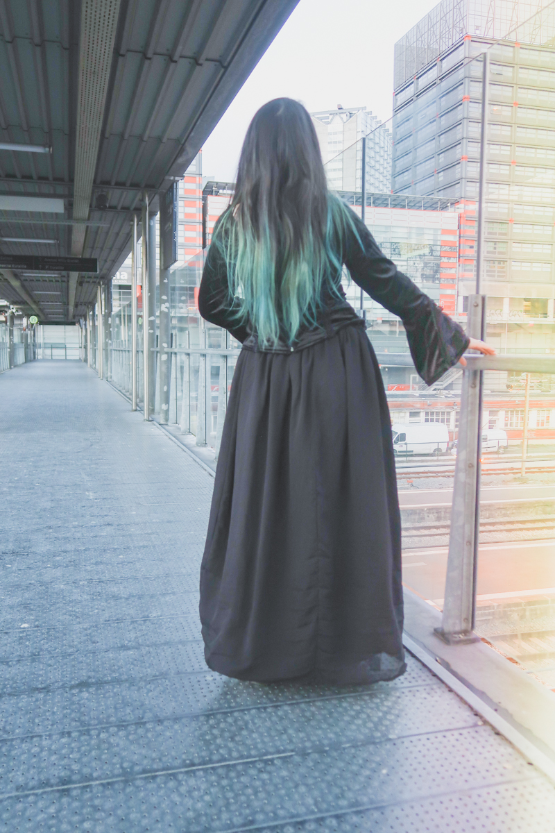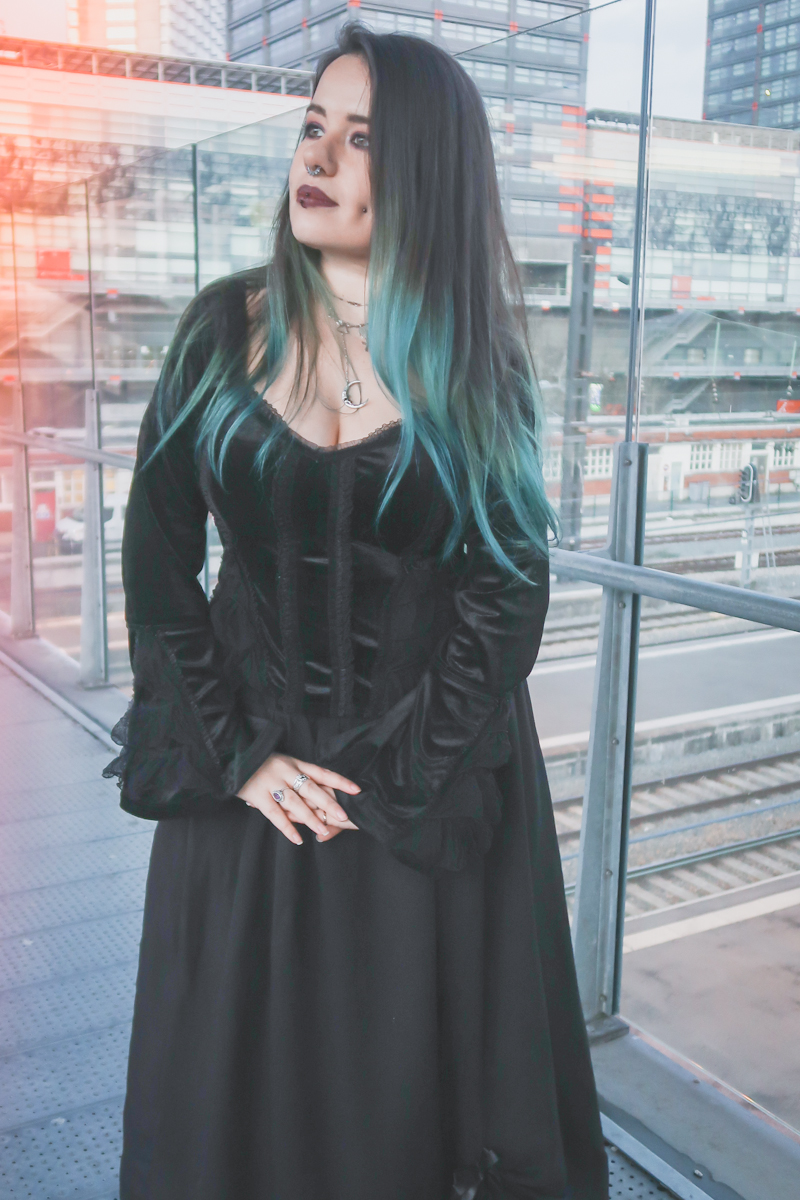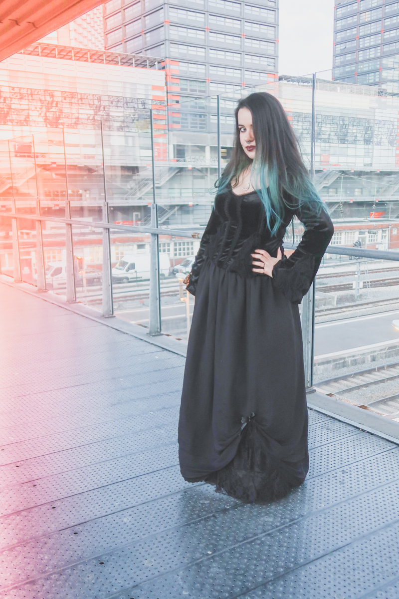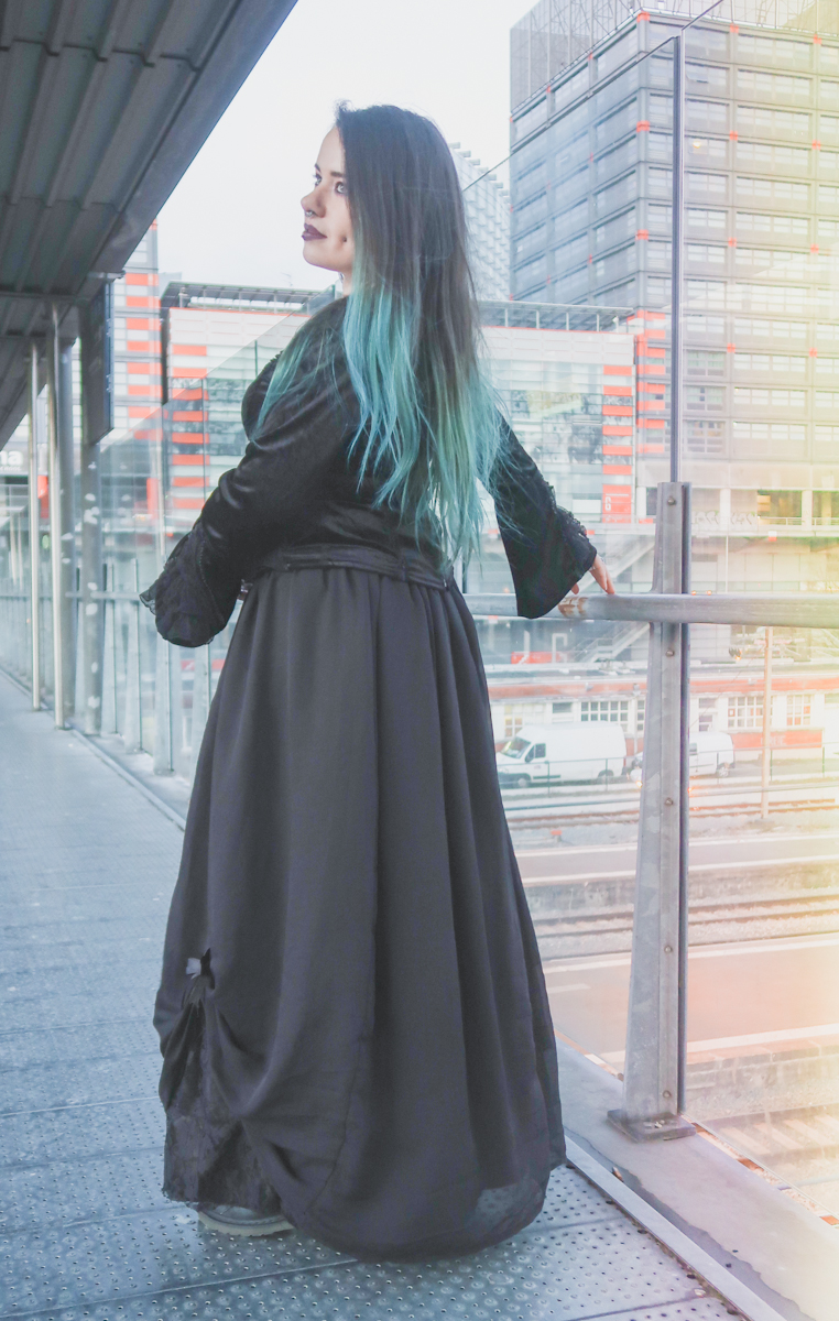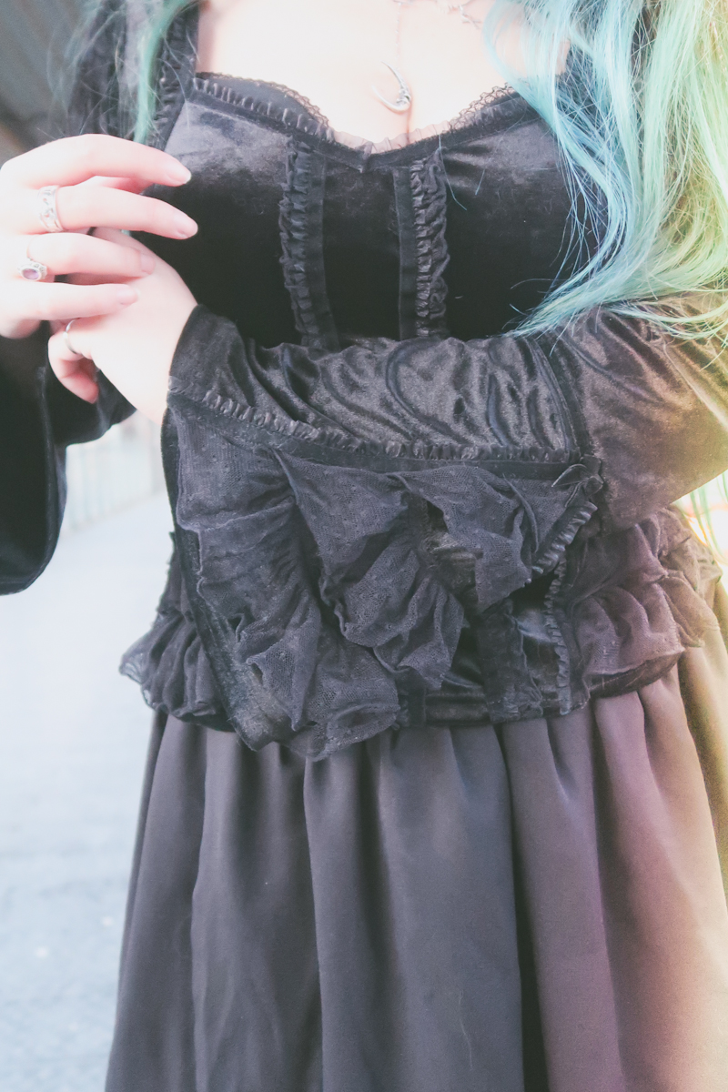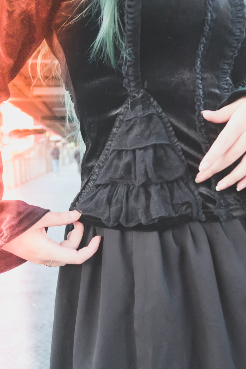 Je porte un haut en velours de chez Sinister, avec de beaux détails. Et une jupe plus simple mais avec un beau volume, de chez Burleska. Les deux pièces ont vécu, il faut le dire, mais se défendent encore bien. Je les porte souvent en ce moment. Impossible de vous dire le prix ou le modèle exactement de chacuns, puisque c’est des fringues que possède depuis 5 ans quoi…