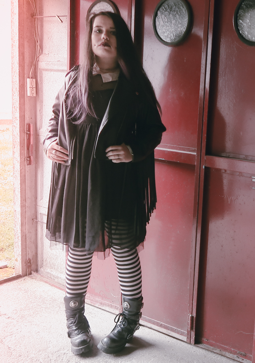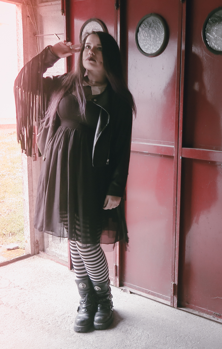 Pour ce look, qui était d’un week-end où il faisait chaud, je porte mon perfecto a franges Zaful que j’adore d’amour car il est méga stylé. Avec cela, je porte une robe à la Mercredi Addams, de chez Hot Topic. Une robe que j’avais achetée en 2016 en Californie mais que je n’avais jamais pu mettre car j’avais très vite pris du poids. Maintenant je la reporte, et je l’adore. Avec sa taille empire, elle est très cool, élégante et légère.